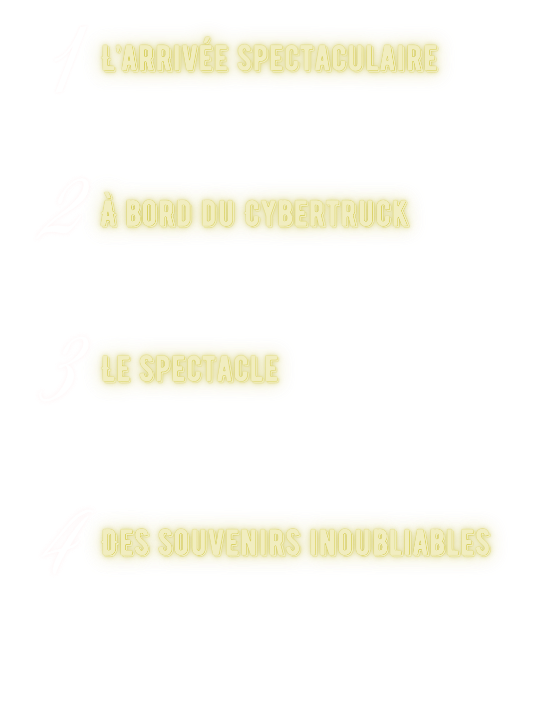 - Temps pour les invités d'explorer l'intérieur et l'extérieur du Cybertruck (séances photos, jeux, karaoké)